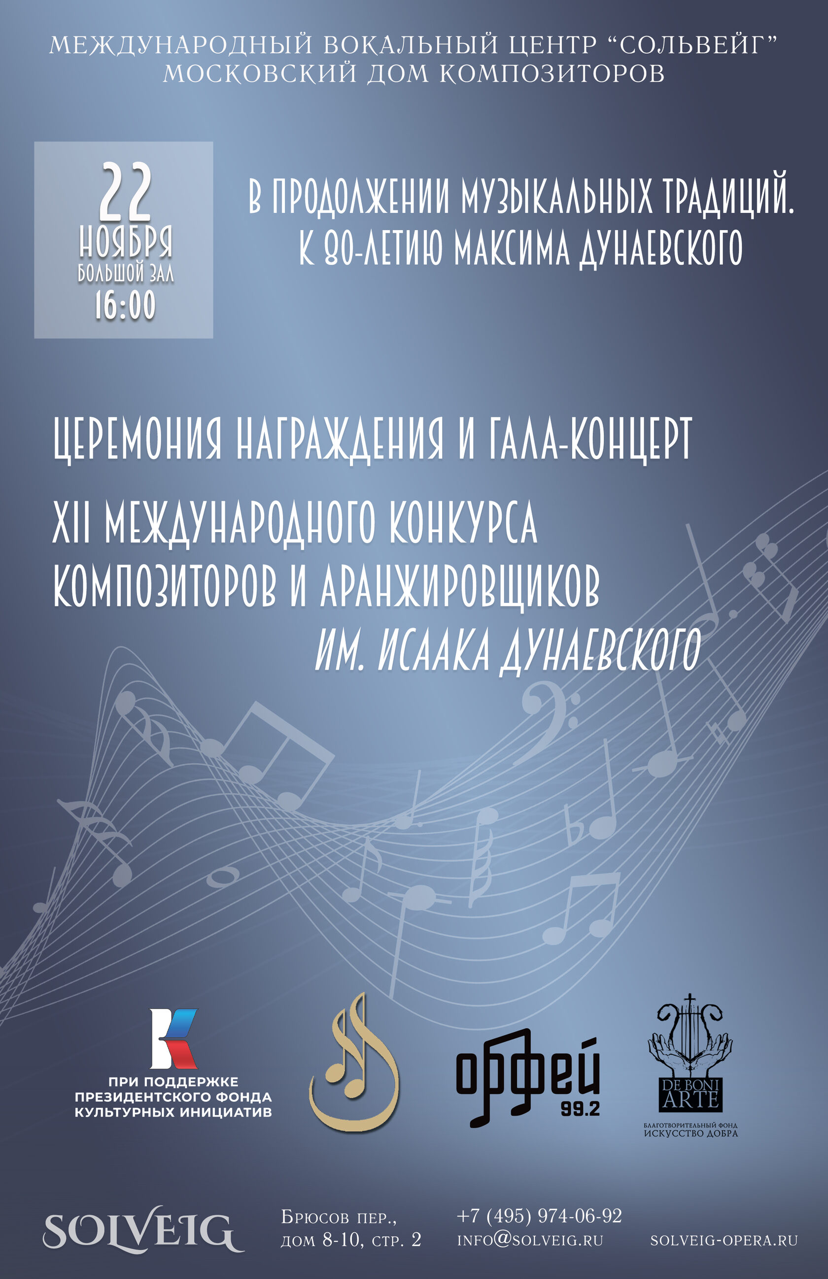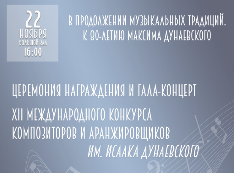 Гала-концерт и Церемония Награждения пройдёт в Московском Доме композиторов 22 ноября в 16:00.